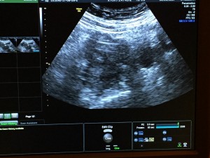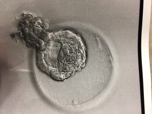 Once we got into the room, I was on a chair with my legs propped up (very similar to when you have your retrieval). The major difference is this time, you’re completely awake! Next, the x-ray tech came in and took some pictures of my cervix and uterus. Then Dr. Miller came in and was very jovial as usual! He said everything looked good, and proceeded to insert the catheter. This part made me feel a little crampy, but the feeling only lasted a minute so it wasn’t too bad – I would compare it to an intense pap. Then the embryologist brought our little embryo out in what looked like a really skinny straw. Dr. Miller inserted the skinny straw into the catheter, and voila, I’m pregnant (until proven otherwise)! Dan and I were able to watch everything on the x-ray screen. We couldn’t see the actual embryo since it’s microscopic, but we were able to see the air bubbles around it. It’s hard to tell in the picture below, but the embryo is the white speck in the middle of the picture. Dr. Miller reiterated that everything went as well as we could have asked for and wished us good luck!