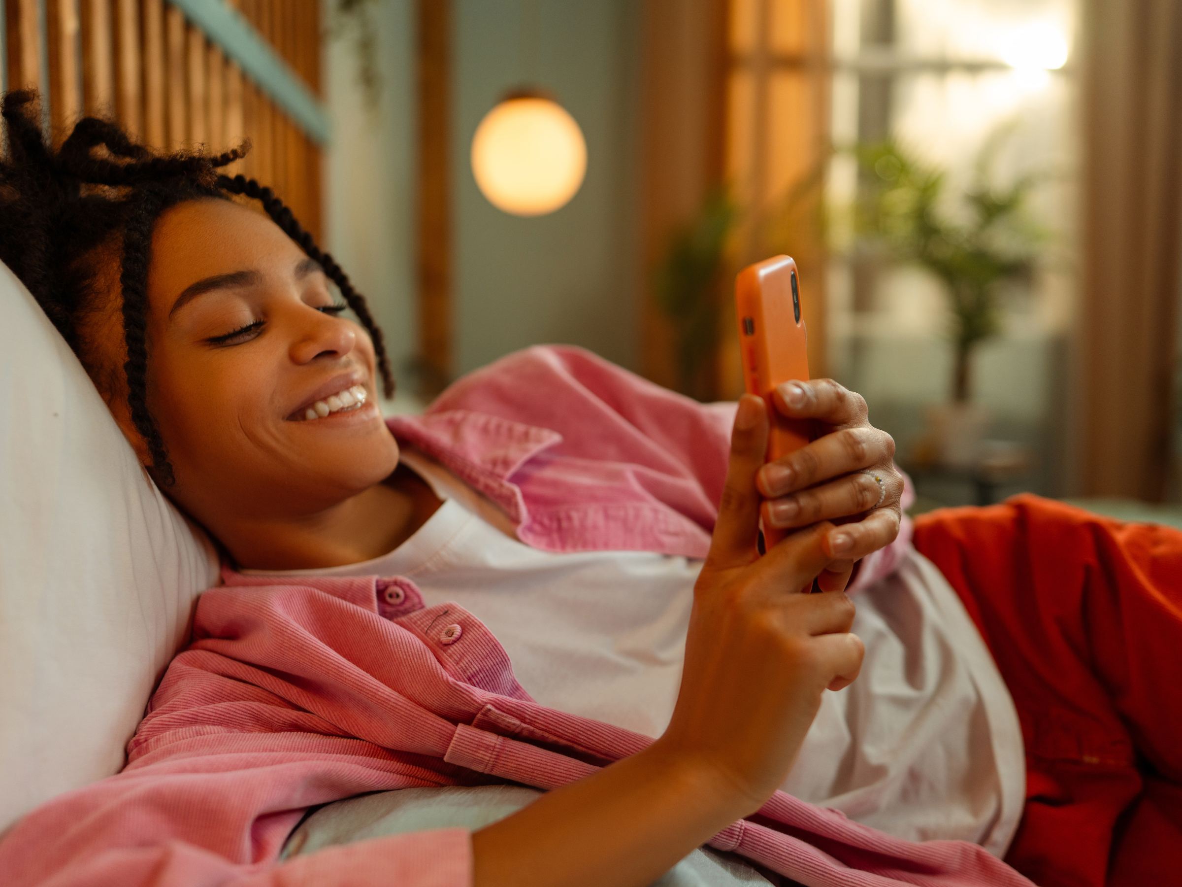 Image of young black woman smiling down at her phone