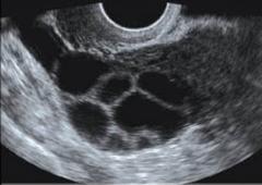 An ultrasound image of stimulated ovary with multiple follicles visible (dark spots)